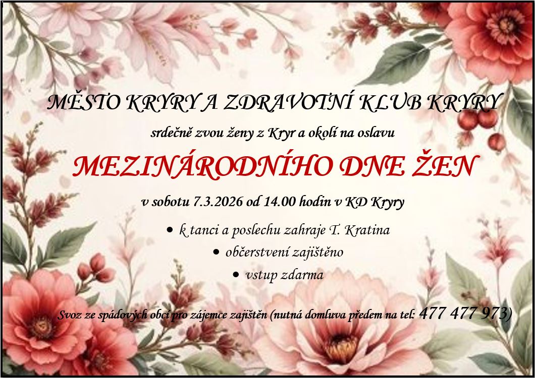 Město Kryry a zdravotní klub Kryry srdečně zvou ženy z Kryr a okolí na oslavu Mezinárodního dne žen v sobotu 7.3.2026 od 14:00 hodin v KD Kryry